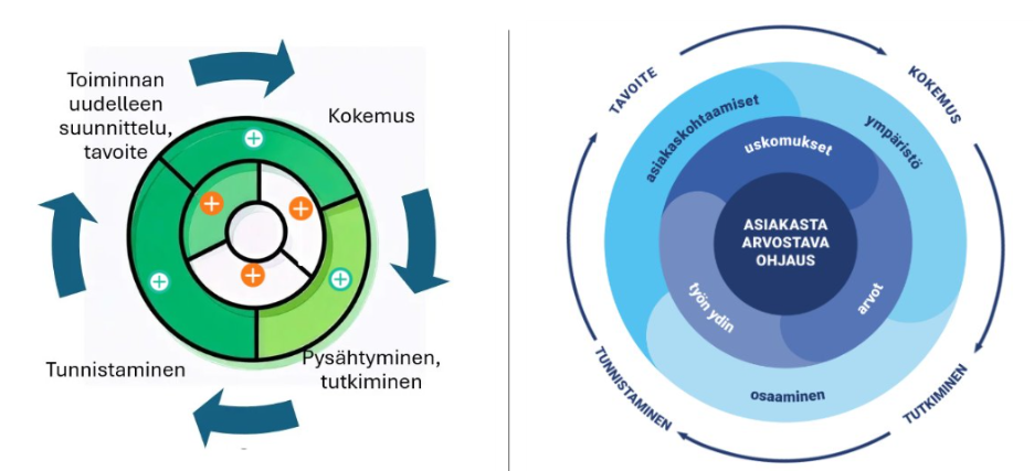 Kohtaaminen valikoitui kehittämisen kohteeksi, koska se oli tunnistettu keskeiseksi tekijäksi vaikuttavan asiakasohjaustyön näkökulmasta. Muutosta kohti viitekehyksestä työkaluksi ohjasi erityisesti asiantuntijoiden esiin nostama kysymys: mitä uutta kehitettävä viitekehys tarjoaa myös kokeneelle ammattilaiselle?