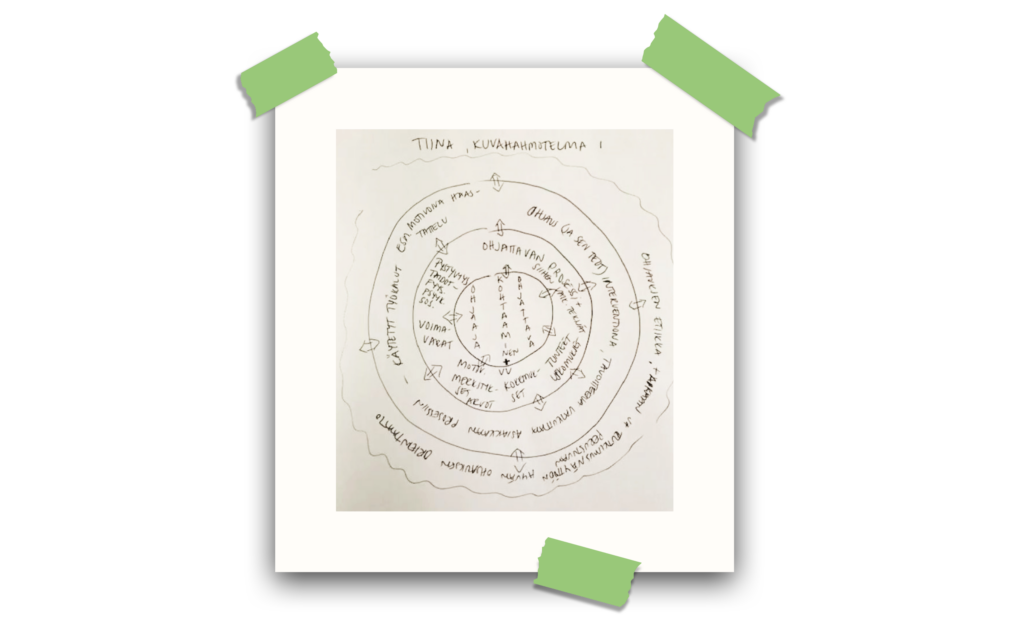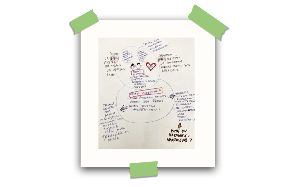 Kehittämisprosessimme alun tiedostettu ja osittain tiedostamaton ihmettelyvaihe tarjosi meille mahdollisuuden yhteisen ymmärryksen rakentamiselle. Tässä vaiheessa kävimme erilaisia keskusteluja liittyen kehittämistiimin jäsenten ymmärrykseen aiheesta, jota herätti muun muassa nämä piirretyt kuvat, mutta myös tavasta toimia. Konkreettisesti tämä yhteisen ymmärryksen syventyminen näkyi muun muassa lisääntyneenä ymmärryksenä toisen alan käytetyistä käsitteistä ja toimintatavoista.