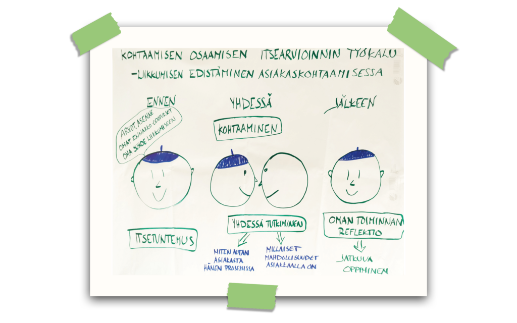 Kuva 6. Visualisoinnin työpajassa syntynyt kohtaamisen itsearvioinnin työkalun sekä prosessikuva.
