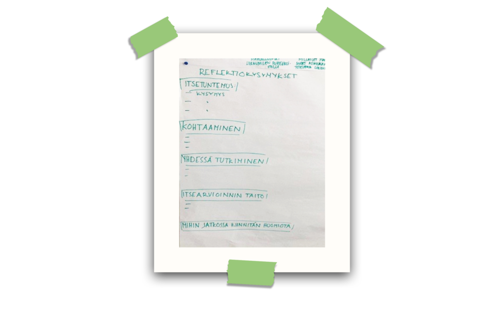 Kuva 7. Visualisoinnin työpajassa syntynyt kohtaamisen itsearvioinnin työkalun reflektiokysymykset.